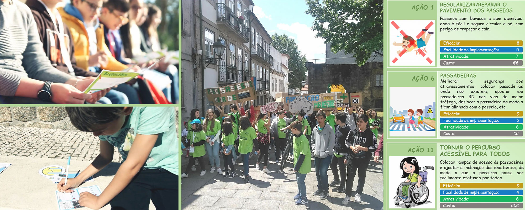 O trabalho com a comunidade escolar decorreu em vários momentos, contando com o apoio dos encarregados de educação na identificação dos principais problemas e receios associados às deslocações dos alunos a pé, visitas de campo realizadas com os alunos percorrendo, em grupo, os percursos preferenciais e identificando os problemas e as potencialidades existentes, aulas de grupo para discutir os problemas e selecionar quais as soluções/ intervenções a efetuar que estimulem as deslocações a pé, em detrimento do automóvel, e criação de um vídeo de sensibilização. Por fim, foi apresentado à comunidade o primeiro percurso a ser intervencionado.