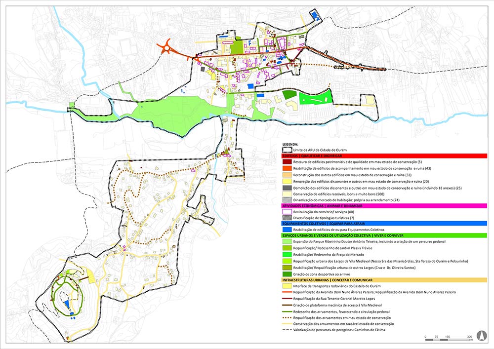 A área de intervenção corresponde à ARU da cidade de Ourém, tal como delimitada e aprovada pelo Município, possuindo uma área de 135,68 hectares que integra a Vila Medieval de Ourém e o Núcleo Histórico da cidade de Ourém (antiga Vila Nova de Ourém), sendo atravessada pela ribeira de Seiça e o seu vale.